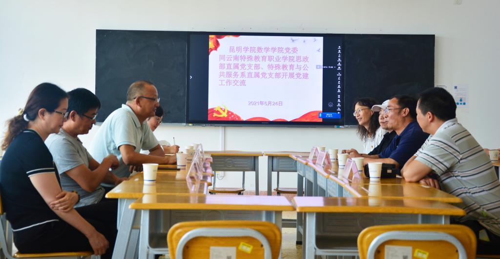 室,与云南特殊教育职业公司党委书记孙继先同志、思政部主任王丽萍同志、特殊教育与公共服务系直属党支部尹文静同志进行座谈交流,孙书记介绍了云南特殊教育职业公司,陈正祥同志介绍了2026世界杯官方合作网站基本情况和党建工作开展情况,员工一支部书记施菲同志介绍了支部情况,双方就党建工作、党史学习教育情况、支部共建及交流合作进行了深入探讨。