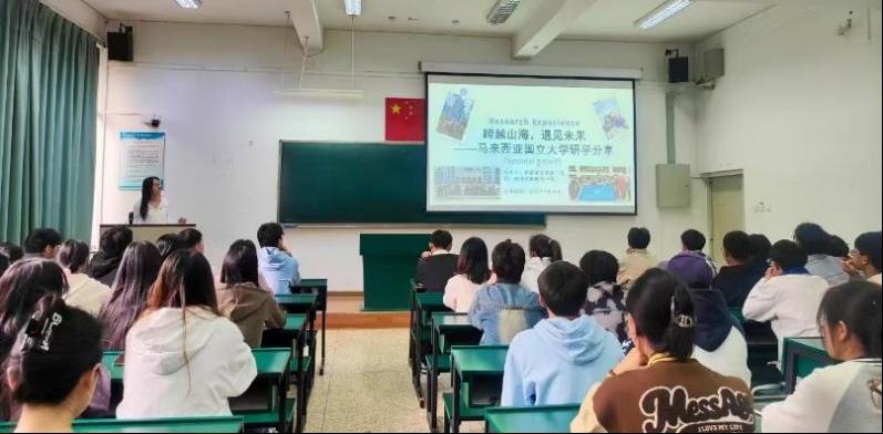 刘一蓉围绕科技兴国、文化交流、青年成长等主题展开分享。她首先结合参访UKM实验室的实践经历,介绍了无刺蜂养殖技术、无刺蜂蜂蜜巧克力与汽水制作。通过视频展示让人直观感受到先进科研设备与学术氛围的魅力。她表示:“语言障碍并未阻挡我们对科技的热情,创新不分国界,青年应以实践精神推动科技突破。”从粉色清真寺的文化沉淀,到传统皮影戏、宗巴舞的活力演绎,再到中央艺术坊手工艺品的匠心传承,研学之旅的文化篇章生动展现了马来西亚的多元魅力,呼吁青年学子立足文化自信,主动承担国际交流使命,既讲好中国故事,也汲取全球智慧。刘一蓉在马六甲海峡边的沉思——“与其困于焦虑,不如将未知视为探索契机”,则引发学子对个人成长的共鸣。
