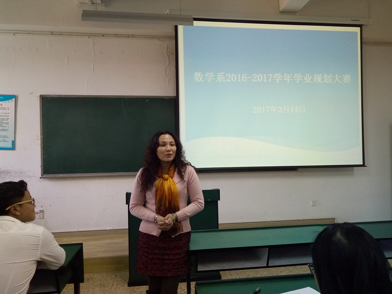 为帮助广老员工明确学习目标,提高学业规划能力,2017年3月14日下午,数学系在博文楼1207举办了2016-2017学年学业规划大赛。系党总支书记罗隽雁出席并作了动员讲话,系党总支副书记王涛、教师教育教研室主任侯红璆、基础数学教研室主任谢芳、系办公室主任赵义、团总支书记梅松波担任评委。我系2016级各班参加了此次比赛。