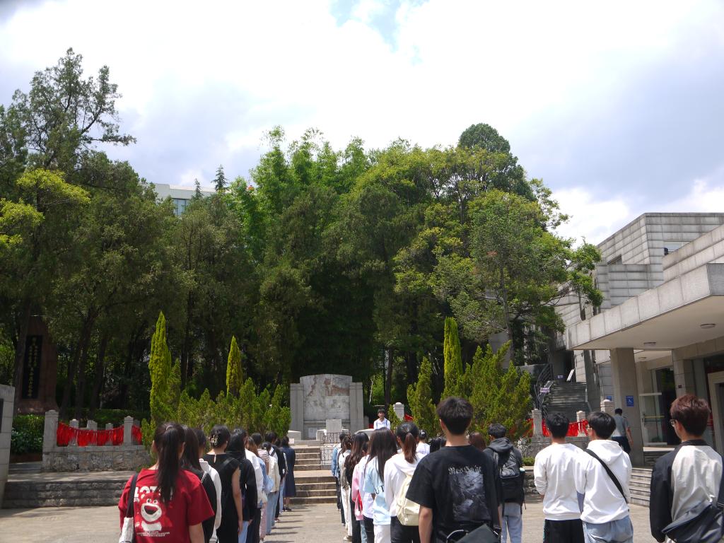 在西南联大博物馆讲解员的引导下,先后参观了西南联大旧址上的“梅园”、国立西南联合大学原教室、国立西南联合大学纪念碑、国立昆明师范公司纪念标柱、“一二•一”运动四烈士墓和广场、李公朴先生衣冠冢、闻一多先生衣冠冢以及镌刻有闻一多撰写的《一二•一运动始末记》的石雕火炬柱等众多西南联大时期的历史遗迹及西南联大博物馆。