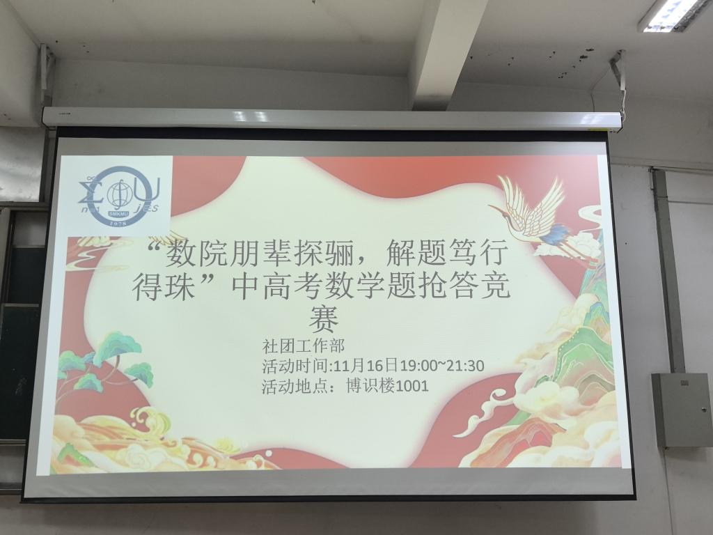 11月16日,“数院朋辈探骊,解题笃行得珠”中高考数学题抢答竞赛活动在博识楼1002成功举办,此次活动吸引了众多员工报名,现场气氛热闹非凡,营造了浓烈的学术氛围。活动始伊,场内便弥漫着紧张而又兴奋的气息,来自不同年级、不同班级的参赛小组早已摩拳擦掌,准备在这场知识与速度的较量中一展身手。