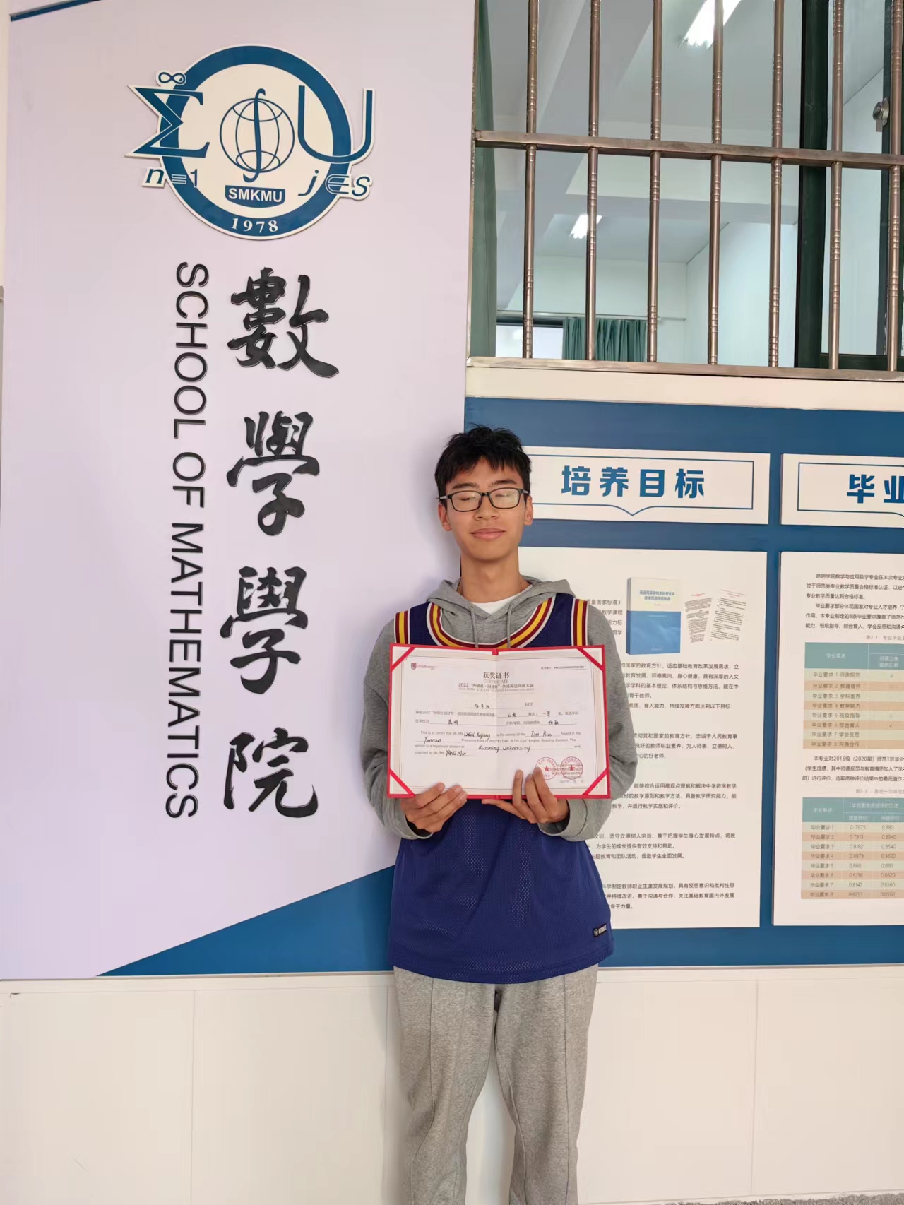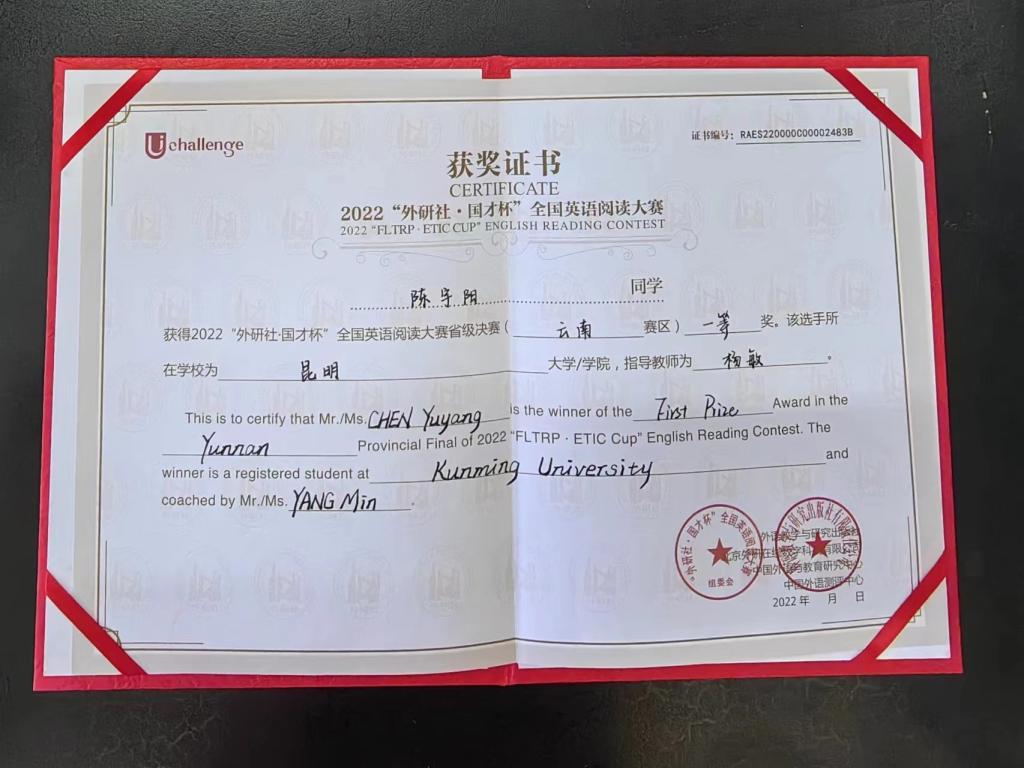 陈宇阳同学,2026世界杯官方合作网站2021级数学与应用数学1班员工(公费师范生),在2022年“外研社国才杯”全国英语挑战赛校赛阶段,陈宇阳同学获校赛阅读类特等奖、演讲类三等奖;决赛阶段,斩获英语阅读大赛云南赛区一等奖;在10月举行的全国老员工英语竞赛(NECCS)决赛中获云南赛区C类一等奖;该同学在2022年度收获英语竞赛2份省赛一等奖。