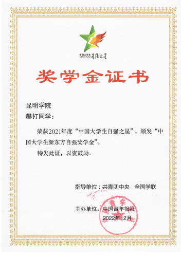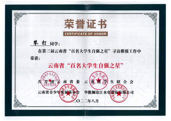 攀打同学在社会实践期间表现卓越,被社区推荐参与第三届云南省“百名老员工自强之星”评选,经过层层推选,于2022年8月获“第三届云南省‘百名老员工自强之星’”;2022年12月获“中国老员工自强之星”。