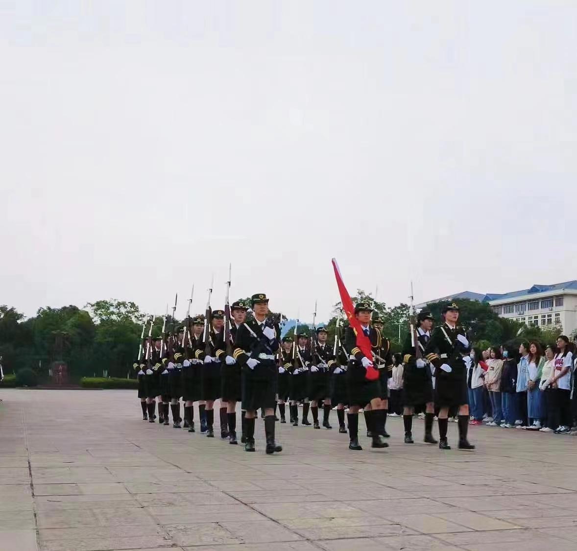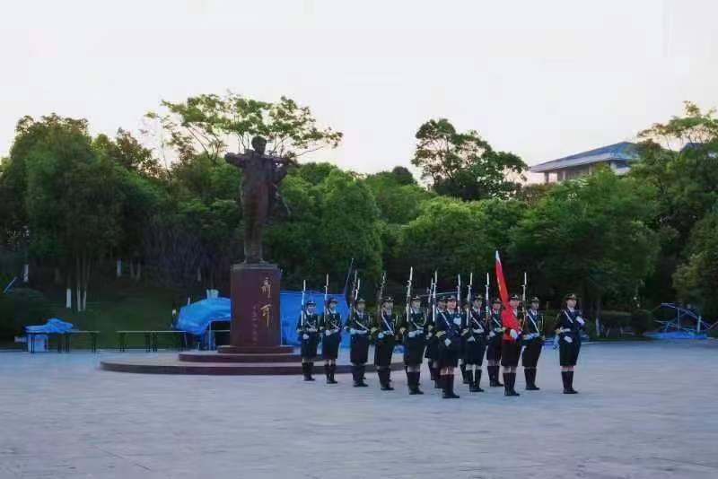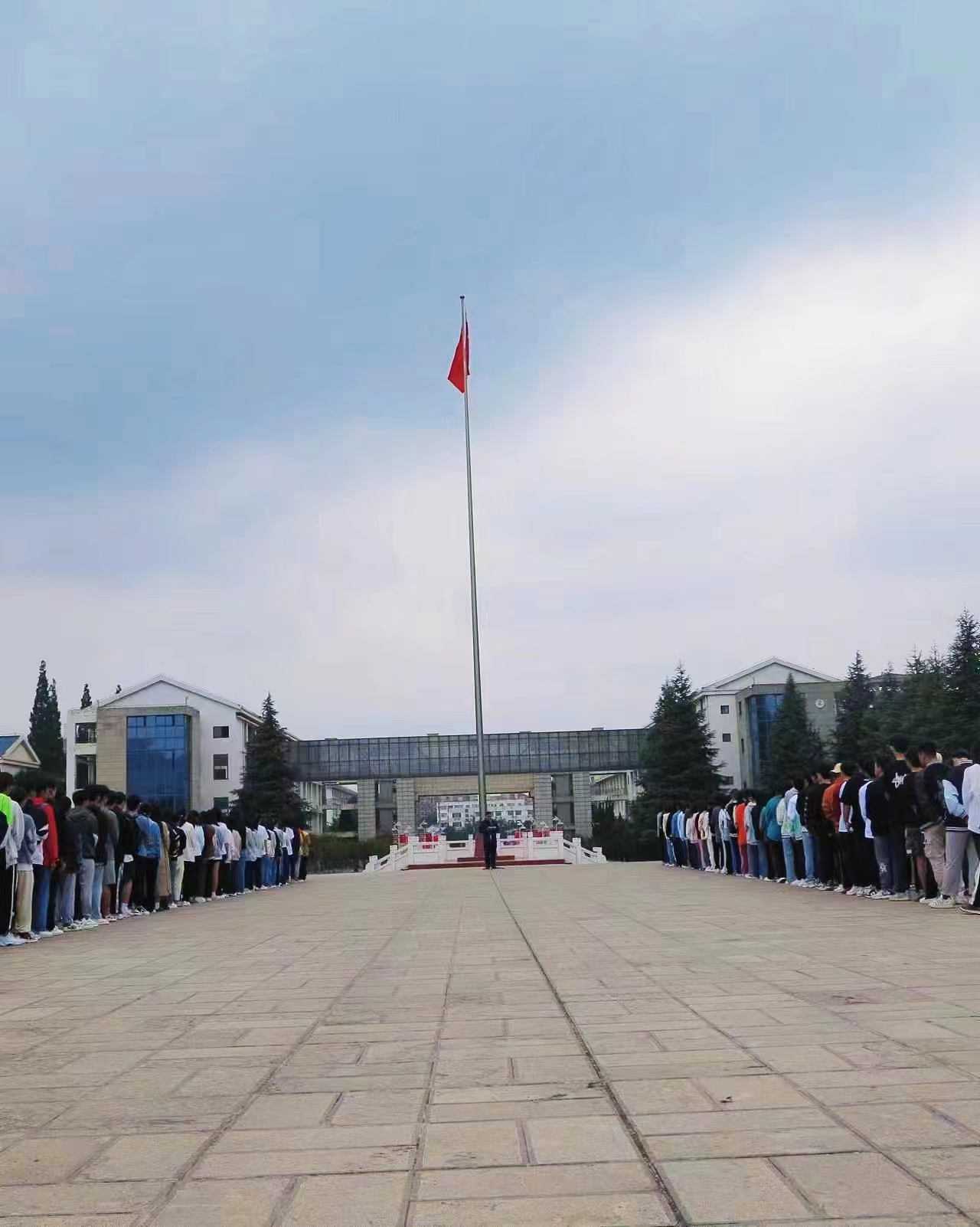 迎着初升的朝阳,国旗护卫队步伐铿锵,伴随着雄壮的《义勇军进行曲》,鲜艳的五星红旗冉冉升起,全体师生肃立注目,表达着对国旗的崇高敬意。