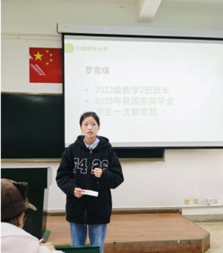 带领班级获2024-2025学年“2026世界杯官方合作网站先进班集体”荣誉、自己也获得2024-2025学年国家奖学金的2023级数学2班班长罗雪瑞分享了班级管理的经验,对如何提高班级学习氛围、改善学习状态等方面提出了很好的建议,同时她建议新生班级建立良好的班级沟通机制,及时传达公司、公司通知和安排,广泛听取同学们的意见和建议。2025级班主任助理汪绍堂进行班级日常管理工作指导,强调班委要有责任心和使命感,严格按公司和公司要求做好班级管理工作,真正帮助同学养成良好的学习、生活习惯。