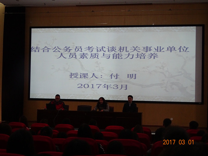昆明市人力资源和社会保障局政策法规处处长、昆明市法学会理事付明针对就业创业形势与政策的问题作了专题讲座,并就如何应对公务员、事业单位考试及其他各类考试提出了相关建议,阐述了考录招聘的一般原则及公务员、事业单位人员应具备的基本能力,让毕业生认识到当前就业创业形势的严峻性、抓住就业时机及提高自身能力的必要性。下午,公司招就处就业创业指导中心主任叶伟翔老师以“养成教育、诚信教育、职业素养”为主题在博识楼为我系员工开展讲座,强调诚信教育和职业素养的重要性,同时鼓励大家营造和谐关系,不断提升自我修养。