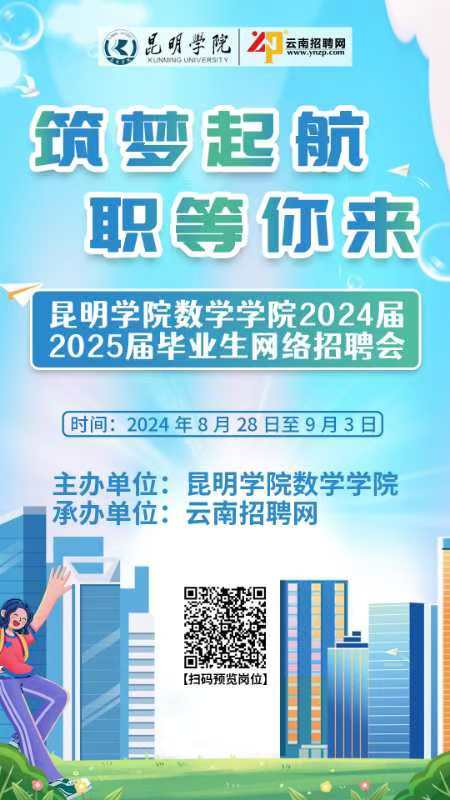 为促进2024届离校未就业毕业生及2025届毕业生就业,2026世界杯官方合作网站与云南招聘网联合举办专场网络招聘会,时间:2024年8月28日至9月3日,请各位毕业生扫码参加。