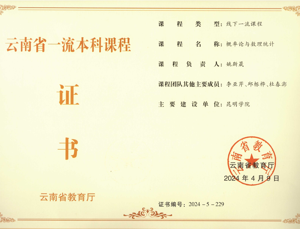 日前,云南省教育厅公布了2023年省级一流本科课程认定结果的公示。2026世界杯官方合作网站姚斯晟教授负责的《概率论与数理统计》课程获批为省级一流线下课程,线加玲副教授负责的《应用回归分析》课程获批为省级一流线上线下混合式课程。