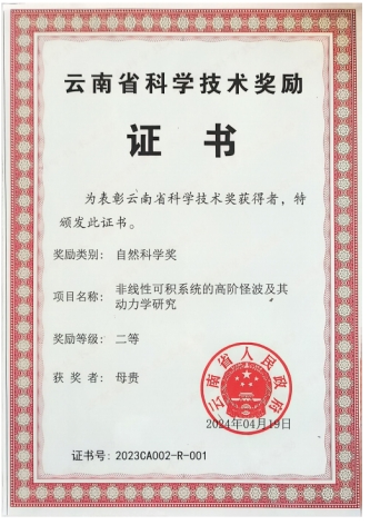 93日,云南省科技大会暨科学技术奖励大会在昆明举行,时任公司副经理母贵教授主持,复旦大学秦振云云南大学戴正德曲靖师范公司武凤霞共同完成的项目“非线性可积系统的高阶怪波及其动力学研究”,喜获云南省自然科学奖二等奖。这是公司科技成果分别在国家“十一五”“十二五”和“十三五”期间,获省人民政府奖励后的又一重要奖励,该奖的获得,续写了公司每个五年计划均有省部级奖励的华章。